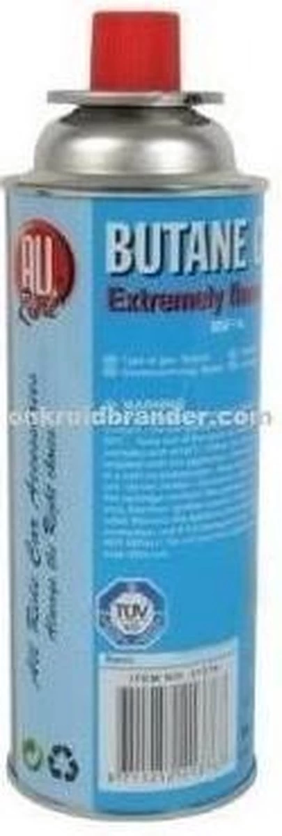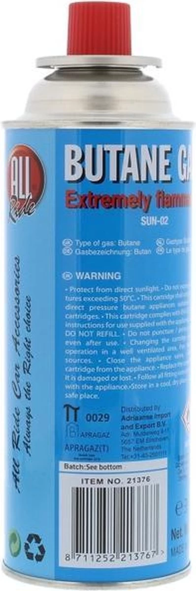 Gasbus van het merk All-ride gevuld met butaan. Wegwerp fles, niet geschikt voor navullen. Standaard aansluiting welke past op kooktoestellen en onkruidbranders