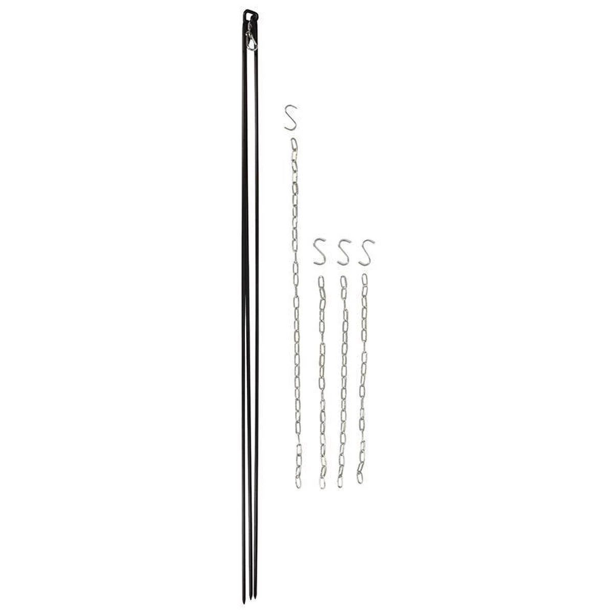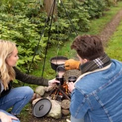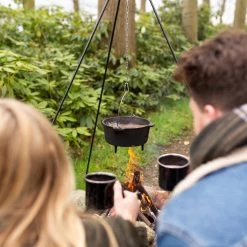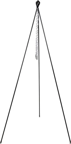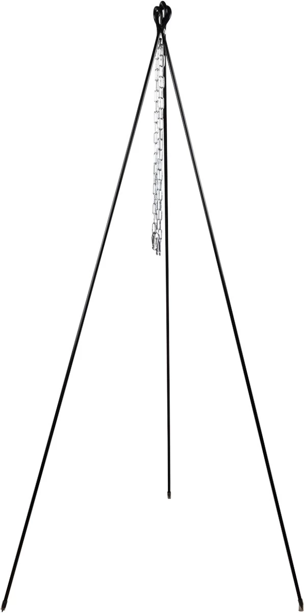 Stevige kampvuur driepoot met ketting. Te gebruiken in combinatie met een kampvuurpot of rond barbeque rooster (beide niet bijgeleverd boven een kampvuur. Snel en gemakkelijk zonder schroeven op te zetten of af te breken. Deze set wordt geleverd met kettingen en karabijnhaken, om op verschillende hoogtes te kunnen koken.