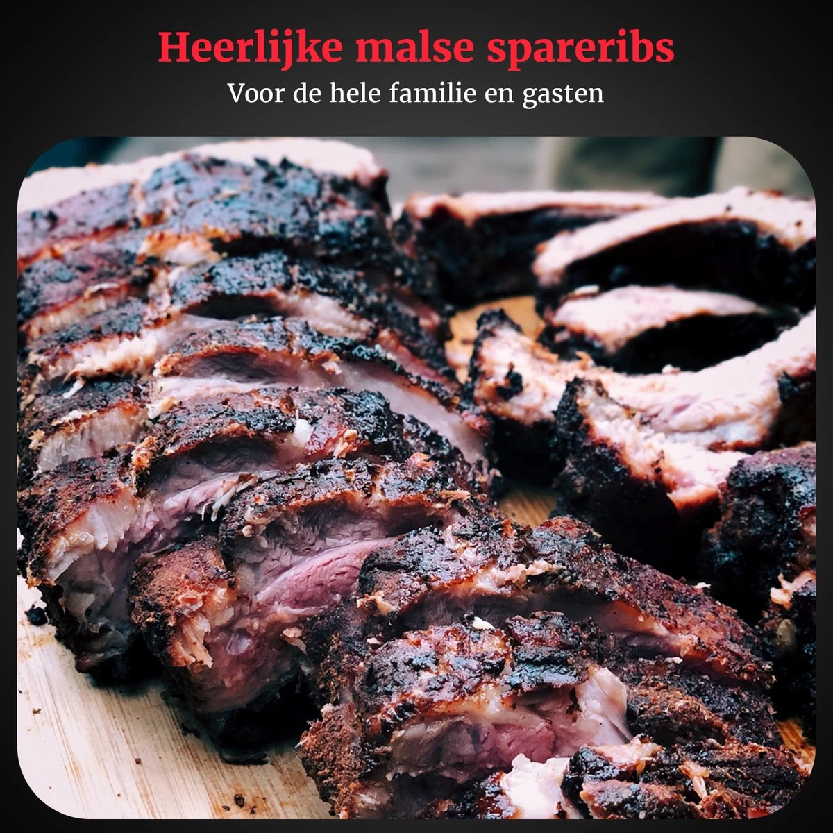 Gaar eenvoudig de heerlijkste spareribs voor al uw gasten. Met een heerlijke marinade maakt u de spareribs smaakvol. Hierna kunt u ze op de barbecue plaatsen met het spareribs rek. Hierdoor kunt u tot wel 6 spareribs tegelijk garen. Hiermee heeft u voor het hele gezin of al uw gasten heerlijke en malse spareribs.