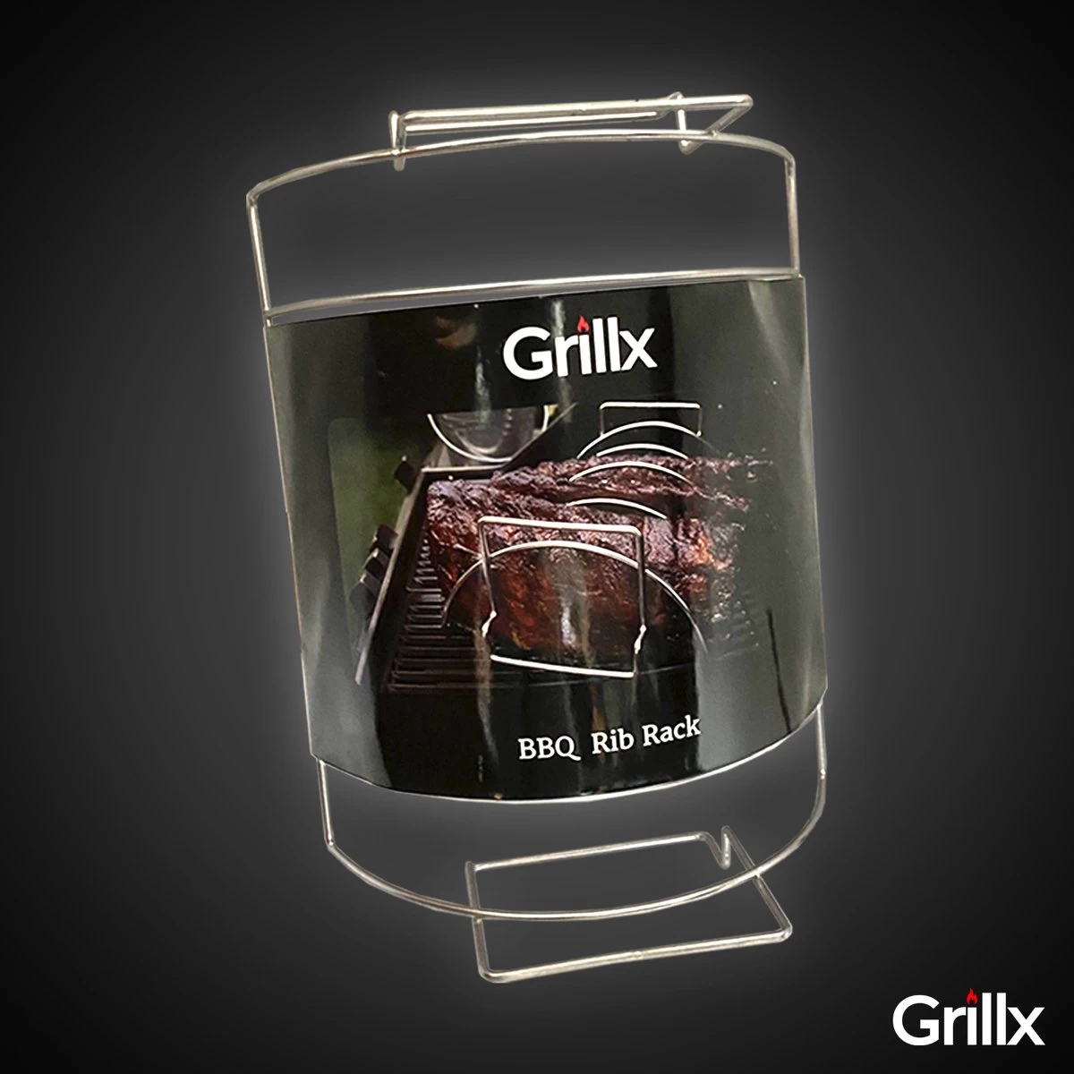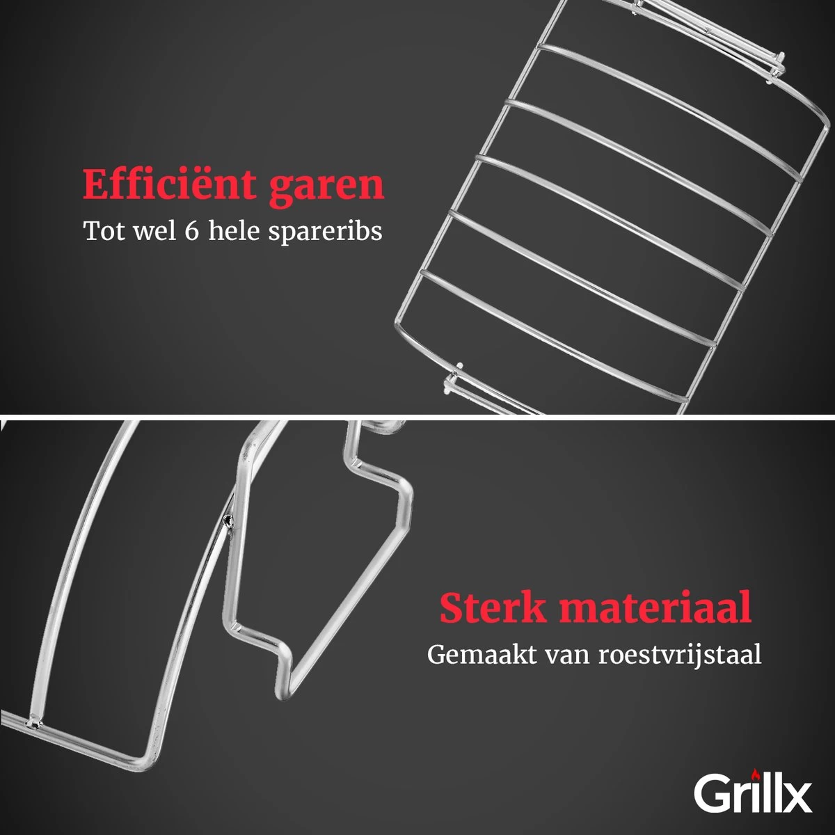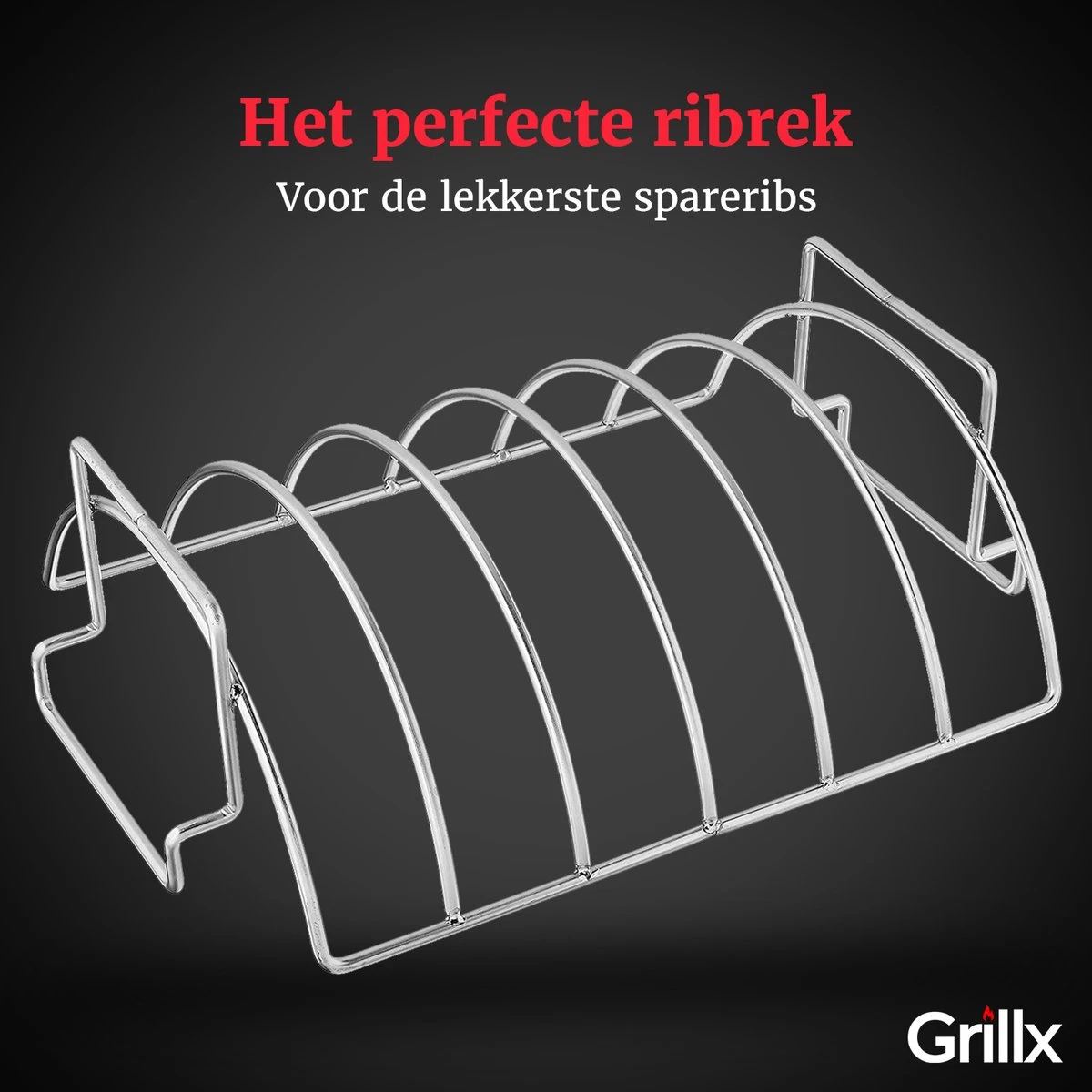 Het sparerib rek van GrillX is onmisbaar voor de perfecte barbecue. Op het ribrek kun je tot wel 6 hele spareribs tegelijk garen. Hierdoor is het lange wachten niet meer nodig. Het BBQ rek is geschikt voor de meeste gasbarbecue’s en ronde barbecue’s vanaf 18 inch. Het sparerib rek is gemaakt van sterk roestvrijstaal en daardoor ook vaatwasserbestendig. Met deze barbecue set zorg jij ervoor dat jouw gasten/familie optimaal kunnen genieten.
